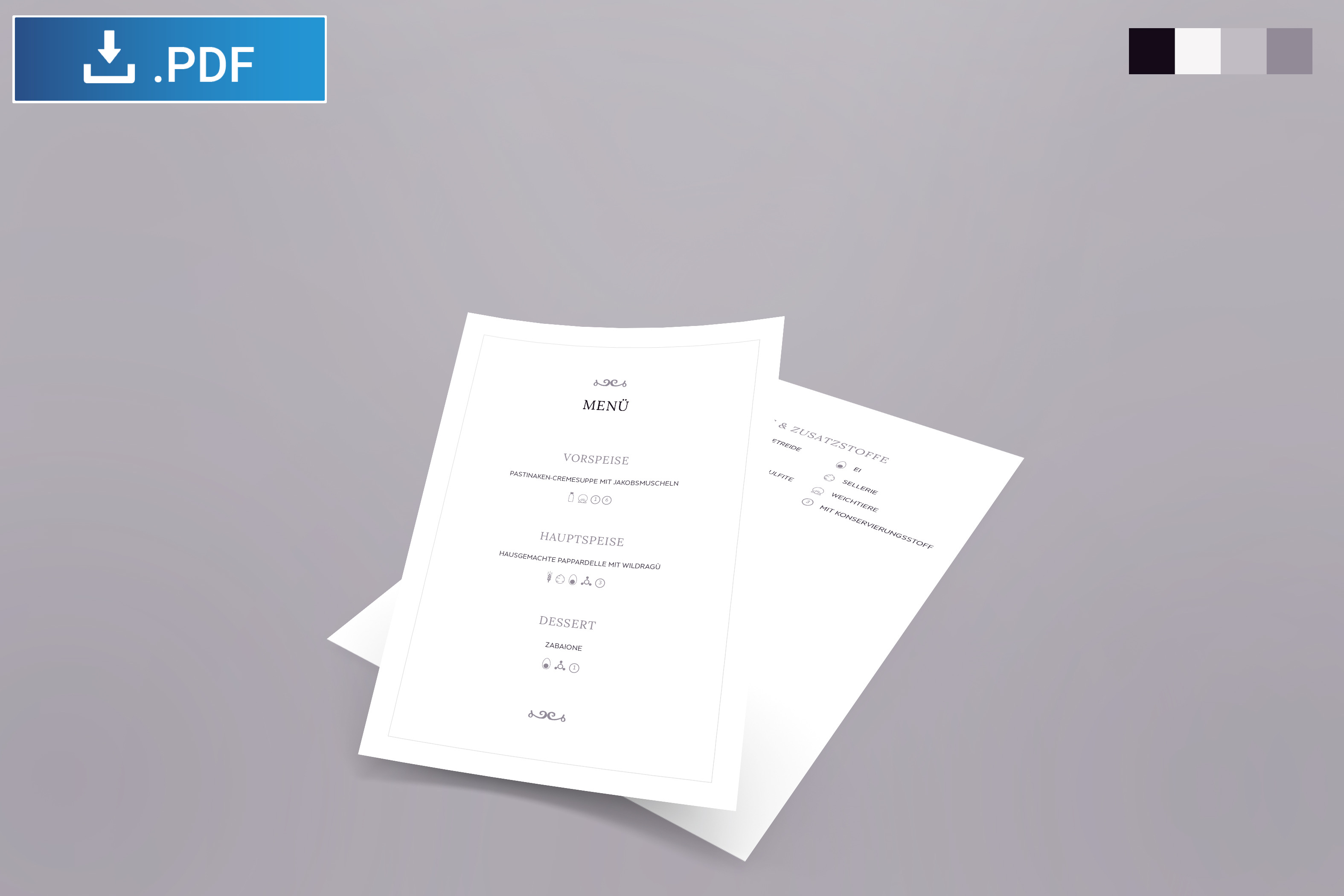 Dieses Menü ist ideal für besondere Anlässe, Banquetts oder Hochzeiten: Zusatzstoff-Symbole sind subtil in die Speisekarte eingearbeitet und doch klar lesbar für Gäste mit Lebensmittelallergien.